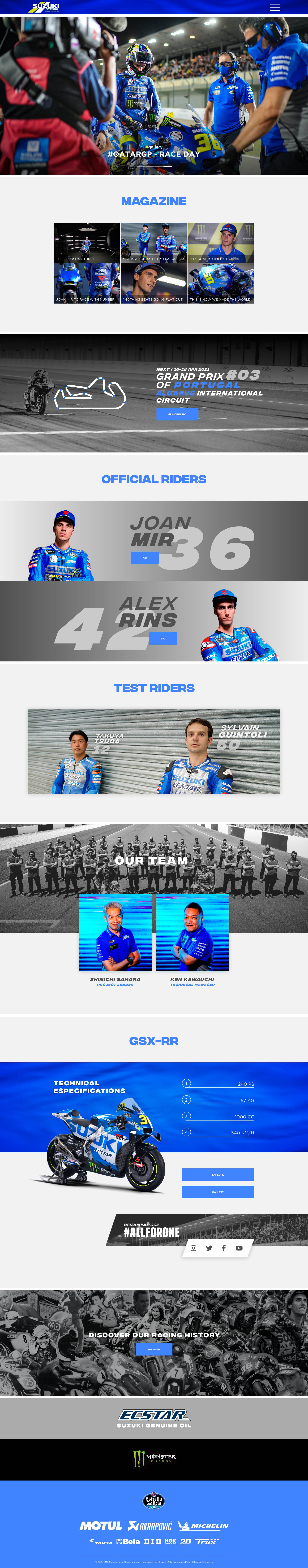 // Ver másSe desarrolló a medida partiendo de prototipos de UX y pasando a funcionales donde se podría navegar rápidamente a los resultados del equipo, notiicas, calendario, circuitos, datos de la moto, bio de los pilotos, el equipo, newsletter, historia de la marca en competición e incluso las fotos de cada gran premio como dossier de prensa. Maquetada en HTML+CSS con base webpack e integrada en PHP con framework laravel y con panel de gestión a medida. Un misil diseñado para ganar